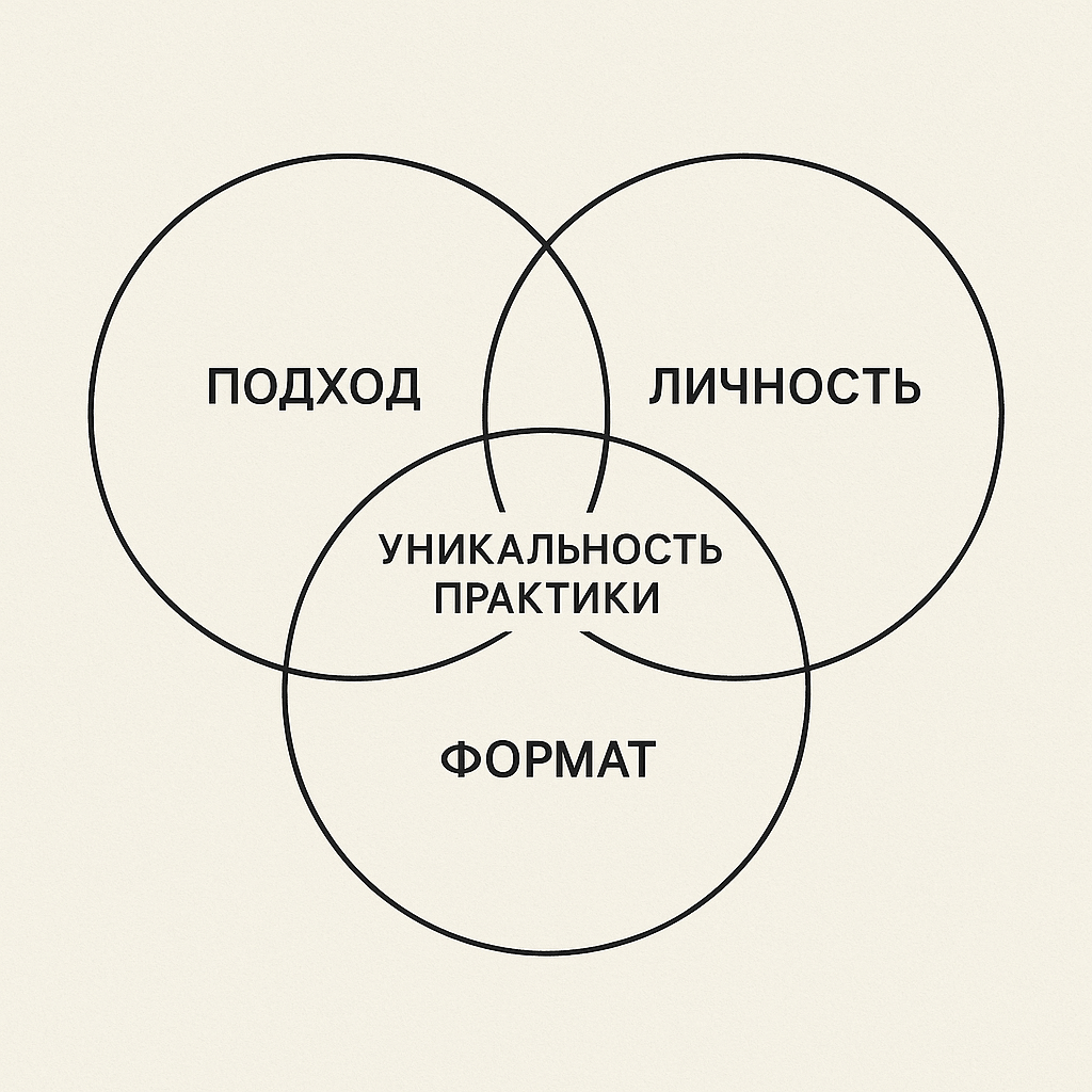Пример. Два гештальт-терапевта, работающие с тревогой у женщин 30+, могут быть полностью разными по подаче. Один — «строгая рука с чутким сердцем», другой — «сестра по боли, через юмор и иронию». Их подход может быть идентичен, но уникальность — в стиле и коммуникации.