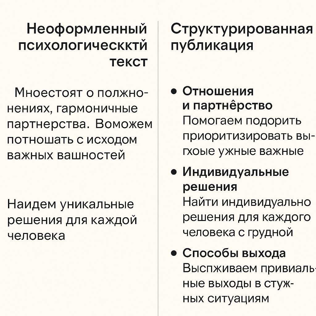Анализ поведения читателей психологического контента выявил, что 64% потенциальных клиентов принимают решение об обращении к специалисту, основываясь на ощущении структурированности его мышления. Эффективные форматы: