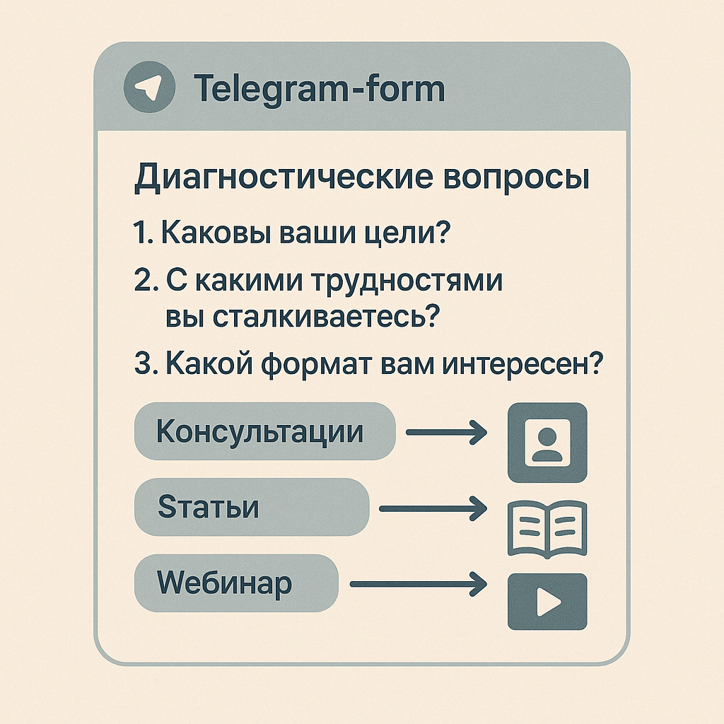Тактика применения: Короткие диагностические формы (3-5 вопросов), которые определяют психологический профиль подписчика и автоматически предлагают релевантный контент или консультацию.