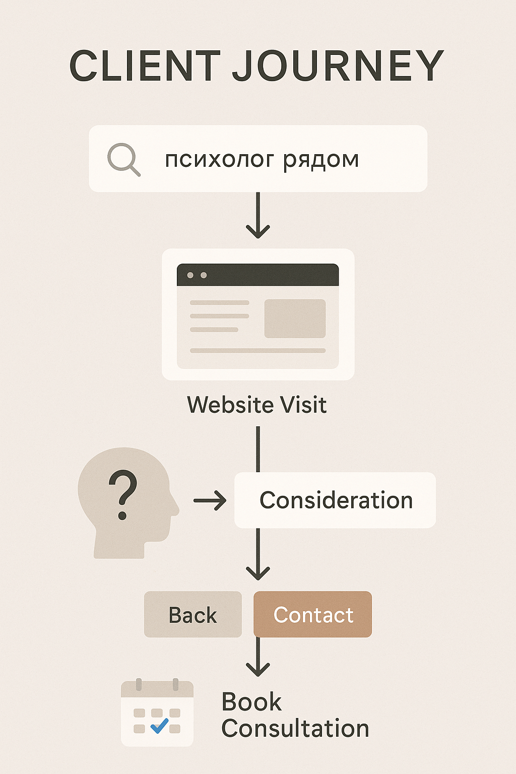 Исследование процесса принятия решений показывает, что 58% потенциальных клиентов психолога испытывают тревогу перед записью на первую консультацию. Эффективный сайт должен смягчать этот переход: